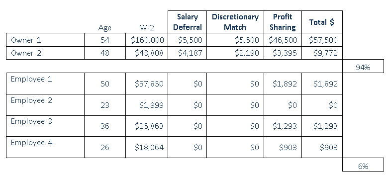 In the current year, the plan will allow the owners to save up to $62,272 with employee contribution of a little over four thousand dollars. Next year, with implementation of the Safe Harbor match provision, their contribution opportunity will increase to close to $80,000 with the required contribution for employees at about the same level as in the prior year.